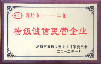 近日,公司被濰坊市誠(chéng)信民營(yíng)企業(yè)評(píng)審委員會(huì)授予“特級(jí)誠(chéng)信民營(yíng)企業(yè)”稱號(hào)。