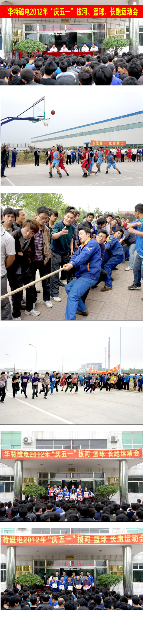 為慶祝五一國際勞動(dòng)節(jié),4月30日,由公司工會(huì)、黨支部、團(tuán)委組織的“華特磁電2012慶五一拔河、籃球、長跑運(yùn)動(dòng)會(huì)”如期舉行。此次活動(dòng)分為籃球賽、拔河、長跑三個(gè)項(xiàng)目,運(yùn)動(dòng)會(huì)場上,各參賽選手精神飽滿,生龍活虎,奮勇爭先,比賽場面異常激烈,現(xiàn)場觀眾吶喊助威,呼聲此起彼伏,熱情高漲。經(jīng)過三個(gè)小時(shí)的激烈角逐,比賽圓滿結(jié)束,公司領(lǐng)導(dǎo)為贏得比賽的優(yōu)手選手頒發(fā)獎(jiǎng)品。