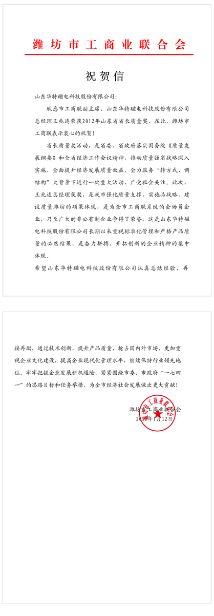 市工商聯來信祝賀公司董事長榮獲山東省省長質量獎