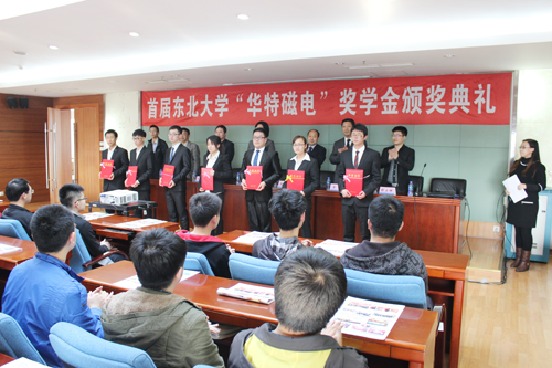 典禮首先由韓躍新宣布獲獎(jiǎng)學(xué)生名單,之后分別由各位公司領(lǐng)導(dǎo)和院校領(lǐng)導(dǎo)為獲得獎(jiǎng)學(xué)金的本科生和研究生頒獎(jiǎng)。獲獎(jiǎng)學(xué)生代表雷洋發(fā)言,表達(dá)了華特磁電公司設(shè)立獎(jiǎng)學(xué)金的感激之情,同時(shí)表示他們一定會(huì)再接再厲,取得更加優(yōu)異的成績(jī)。李鶴主任代表張學(xué)良教育基金會(huì)為王兆連董事長(zhǎng)頒發(fā)了捐贈(zèng)證書。隨后,王董事長(zhǎng)向大家簡(jiǎn)單介紹了公司的工作方向、發(fā)展前景以及設(shè)立獎(jiǎng)學(xué)金的意義。最后,王立慧書記向所有獲獎(jiǎng)學(xué)生表示祝賀,并代表學(xué)院感謝我公司設(shè)立獎(jiǎng)學(xué)金幫助學(xué)生成長(zhǎng)成才,希望全體獲獎(jiǎng)學(xué)生學(xué)會(huì)感恩,回報(bào)社會(huì)。
