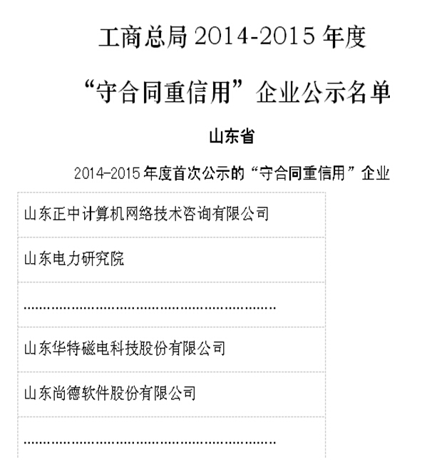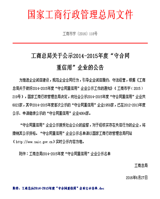 近日國家工商行政管理總局以工商市字(2016)118號發(fā)布了工商總局關于公司2014-2015年度“守合同重信用”企業(yè)的公告,華特公司名列其中。近年來華特公司積極推進誠信建設,嚴格規(guī)范合同行為,誠信履約、守法經(jīng)營,得到了上級主管部門和客戶的一致好評,一直是山東省“守合同重信用”企業(yè),本次列入國家級“守合同重信用”企業(yè)是對公司規(guī)范化管理的肯定,將進一步推動企業(yè)的快速發(fā)展,促進企業(yè)向國際領先的磁力應用系統(tǒng)服務商邁進。