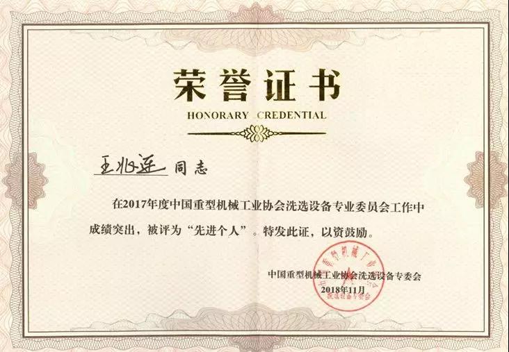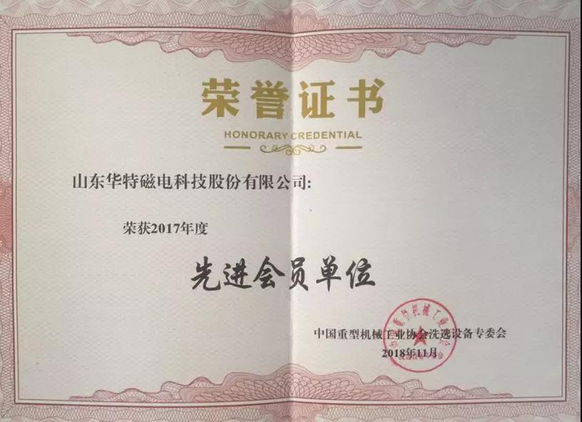 中國(guó)重型機(jī)械工業(yè)協(xié)會(huì)洗選設(shè)備專業(yè)委員會(huì)副理事長(zhǎng)、鎮(zhèn)江電磁設(shè)備廠有限責(zé)任公司董事長(zhǎng)楊鋼宣讀了2017年度優(yōu)秀單位及優(yōu)秀協(xié)會(huì)工作者的表彰決定,山東華特磁電科技股份有限公司被評(píng)為“2017年度先進(jìn)會(huì)員單位”,董事長(zhǎng)王兆連被評(píng)為“先進(jìn)個(gè)人”。