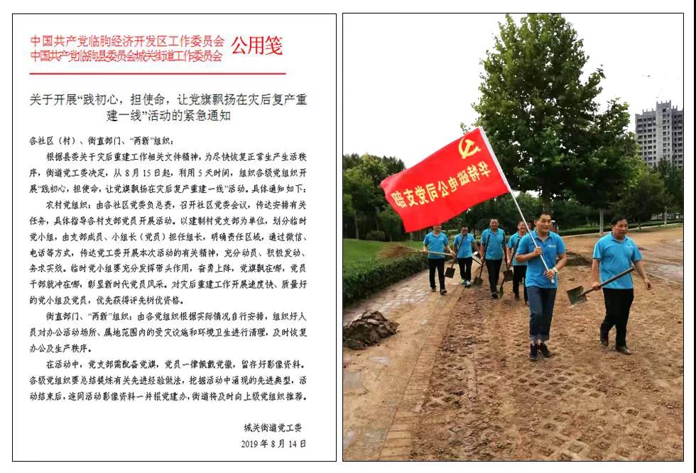 公司黨支部響應城關街道黨工委“關于開展‘踐初心,擔使命’讓黨旗飄揚在災后復產重建一線”活動號召,公司黨支部組織協調共青團、工會,組織廣大黨員干部迅速行動起來,開展了“發揮黨員先鋒模范作用,打贏災后重建攻堅戰”活動,帶領廣大干部員工投入災后復產自救,將災后損失降到最低。